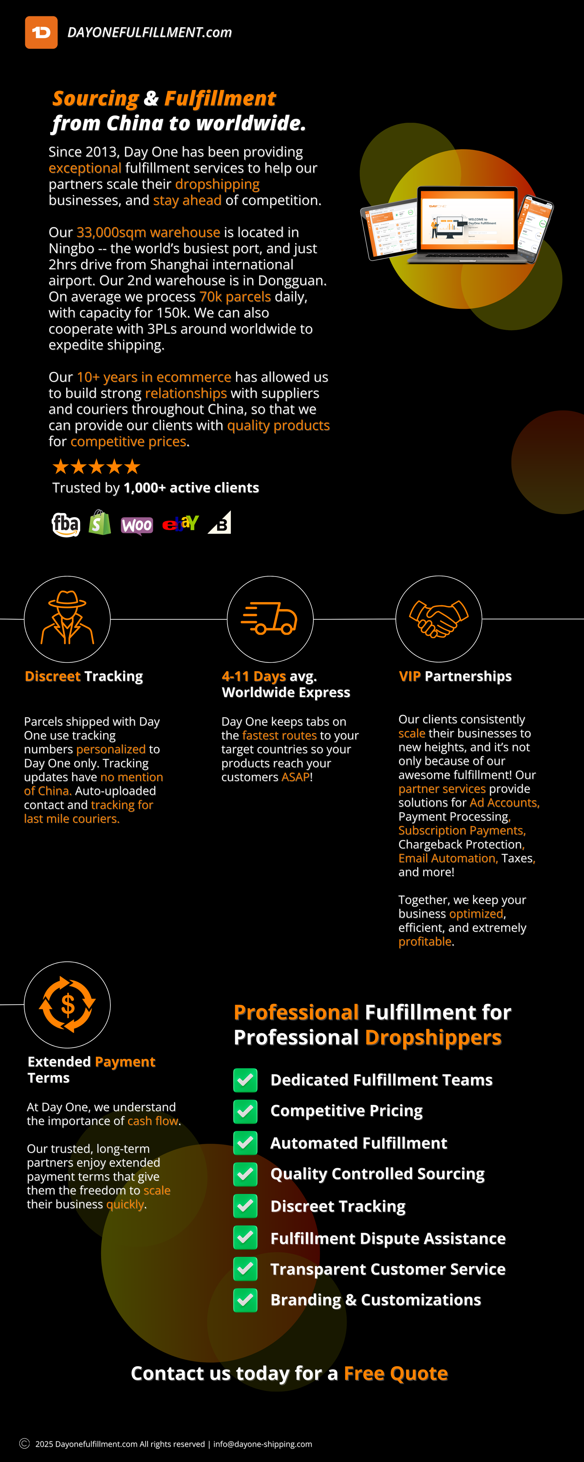 Our team at Day One is excited for the prospect of helping your ecommerce business source, fulfill, and scale!